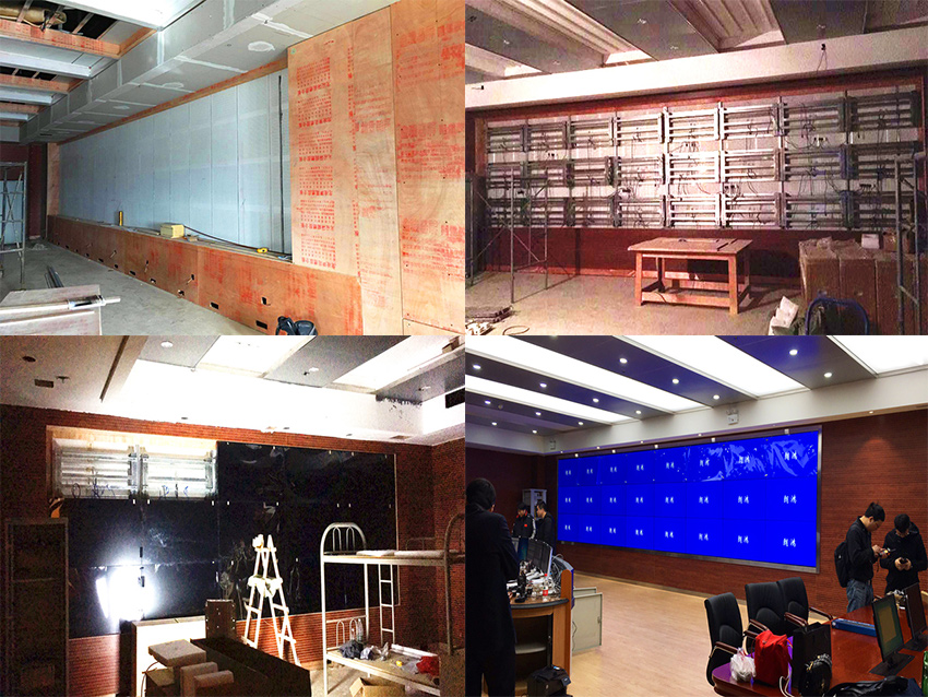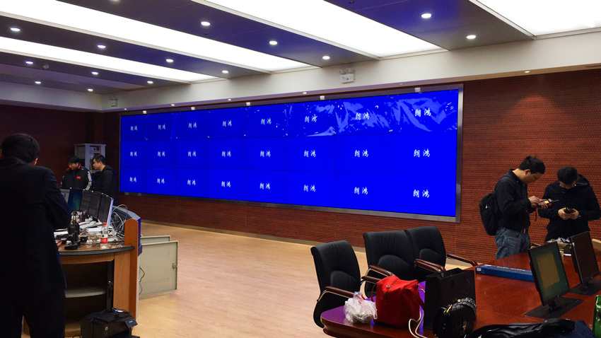 此次項目較大較為復雜,時間緊任務急,要在指揮中心安裝兩套大屏,分別采用信弘55寸(S55-XHL1ME)1.8mm拼縫,3×8,24塊液晶拼接屏,和55寸(S55-XHL2ME)3.5mm拼縫,3×5,15塊液晶拼接屏,前維護安裝方式。為保證項目整體順利實施,信弘工程師克服了現場諸多困難,努力將細節之處做到完美,安裝、調試、驗收、培訓等都非常順利,在春運前順利完成施工。